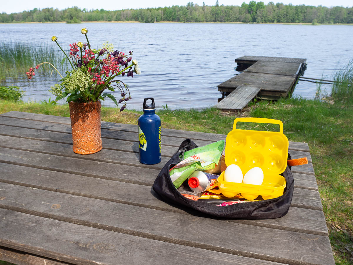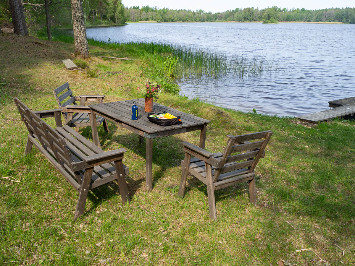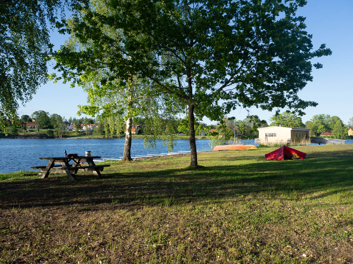 I was less tired and sore this time than during my previous hike. Even though that one was just a long weekend, and an entire month has passed, I’m still feeling the benefits. And I’d had two days of warm-up, so all my muscles were in good shape. The part that got tired were my feet. Training doesn’t seem to help – after a full day of walking, the soles of my feet just get sore. Proper sit-down stops, even taking my boots and socks off, kept me going, all the way to Forssjö. The map promised a lakeside beach in Forssjö, and if that were to turn out not tent-friendly then at the very least there’s always some flat, grassy no-mans-land on the outskirts of a town.