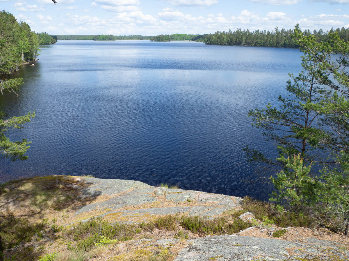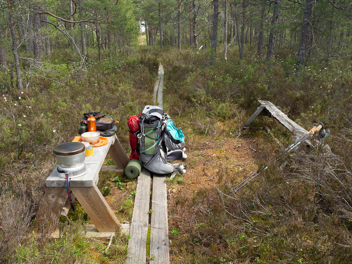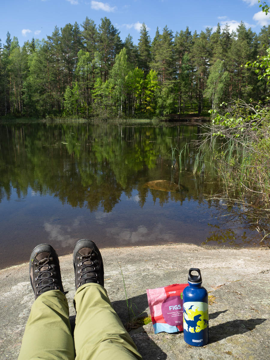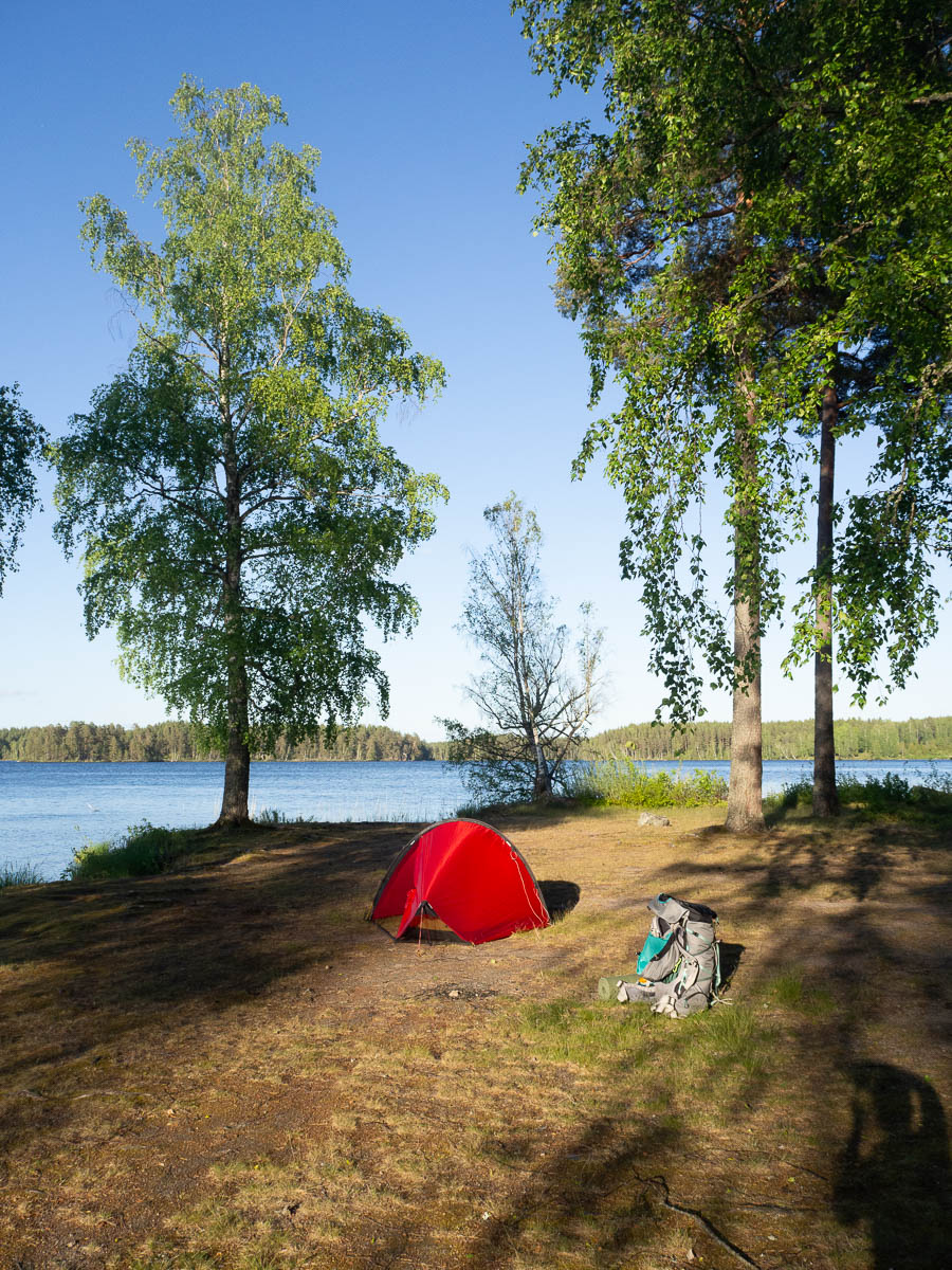 I stopped for the night at a municipal lakeside beach on Fagerö. According to the map there’s a shelter coming up in just over a kilometre, but it’s open towards the west, and that’s where the (strong) winds were coming from, so I chose an east-facing spot instead.