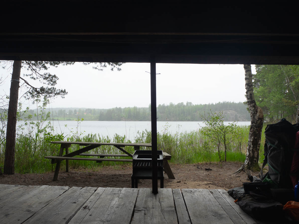 Today was the day that the weather app had originally forecast a full day of pouring rain for, but that got downgraded over time, until all that was left was some rain in the morning. I had reached a lakeside shelter and had my breakfast shortly before the rain was supposed to arrive, and thought that I might sit it out in the shelter. It would be convenient to not have any wet gear to pack.