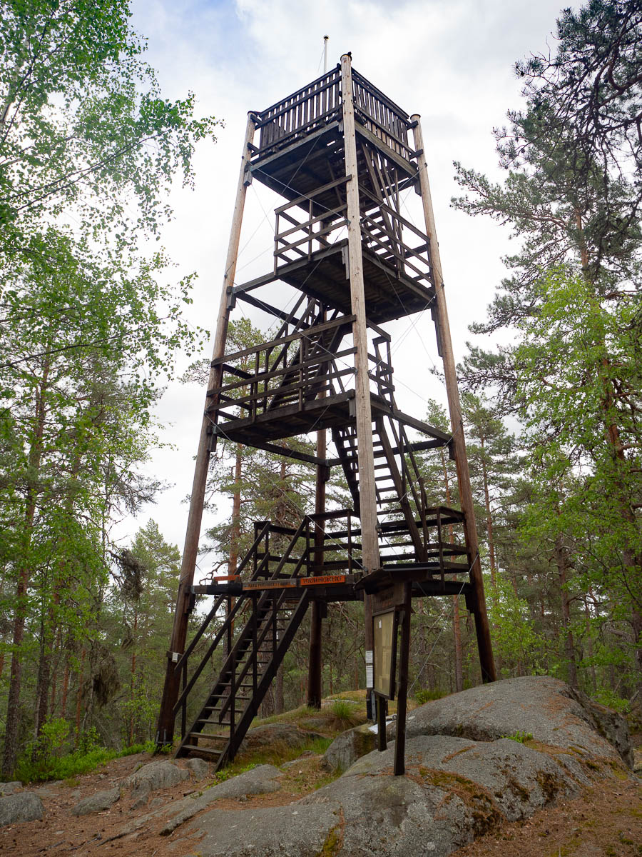 My lunch stop was at the top of Vensbrinksberget, the highest point in Sörmland. It has a viewing tower, which I now climbed. I’m impressed by the work that must have gone into this – hauling all the materials up here, and then building the tower. How do you even build a tower like this, in a place like this?