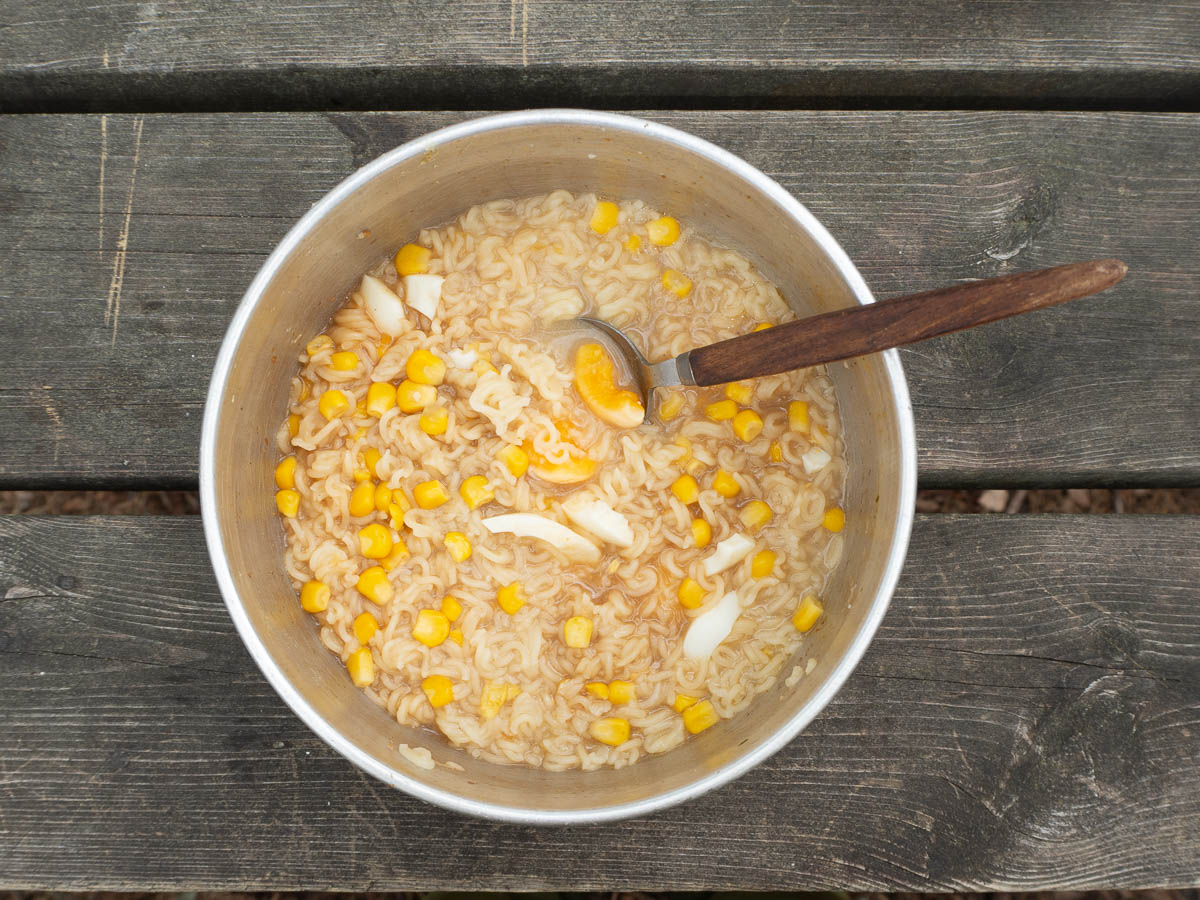 My current go-to lunch on overnight hikes is instant noodles that I top up with other stuff to make it more filling. For this trip, my noodle toppings are canned sweetcorn and hard-boiled eggs. Half a small can of corn is just right for one portion of noodles, and the other half keeps well enough overnight in a small air-tight container.