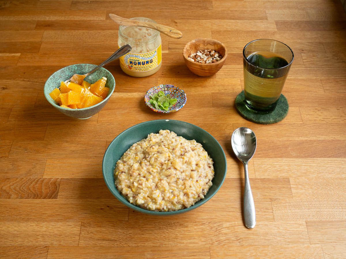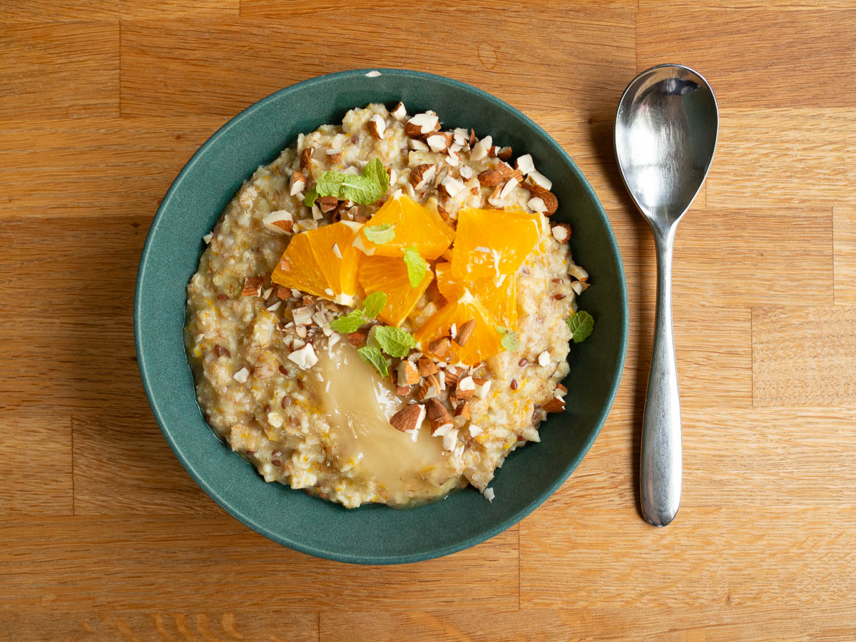 (Mixed-grain porridge with orange zest, served with honey, sliced orange, chopped almonds and fresh mint.)