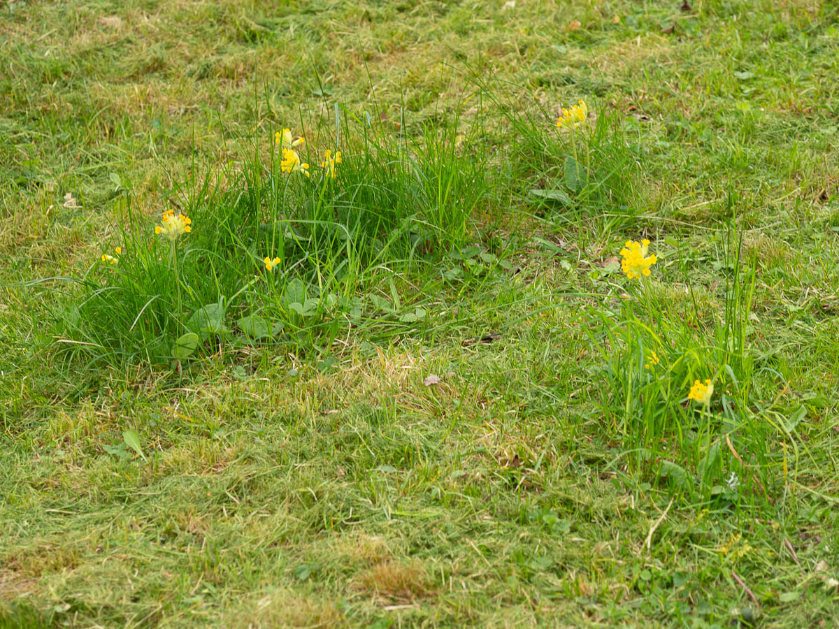 The lawn needs mowing, but the primroses are still flowering, so it’s a precision exercise to mow around and between the primrose clusters.