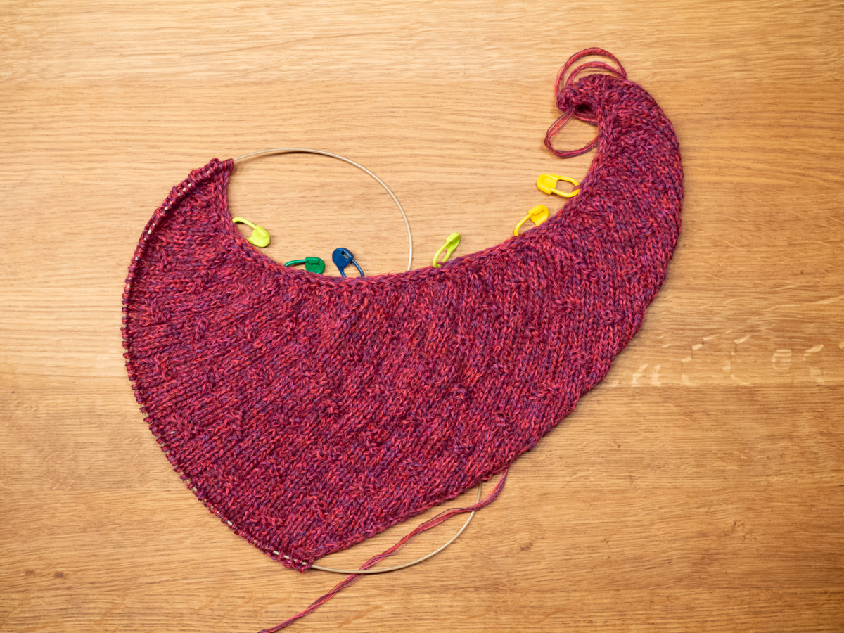 The yarn I bought online some time ago. Maybe the colour wasn’t exactly like I imagined from the photos, but it’s still quite pretty (better in daylight than in this late-night lamplight) and feels very, very nice. Some combination of merino wool, silk and cashmere, according to the description. It’s an unplied yarn, if it can even be called “a yarn”: it’s an unplied bundle of eight very, very thin threads, thinner even than sewing thread. Some are red and some are purple, and they’re probably all made of different fibres. It’s tricky to knit with, easy to miss some of the threads with the needle – definitely not something I could knit without looking at what I’m doing.