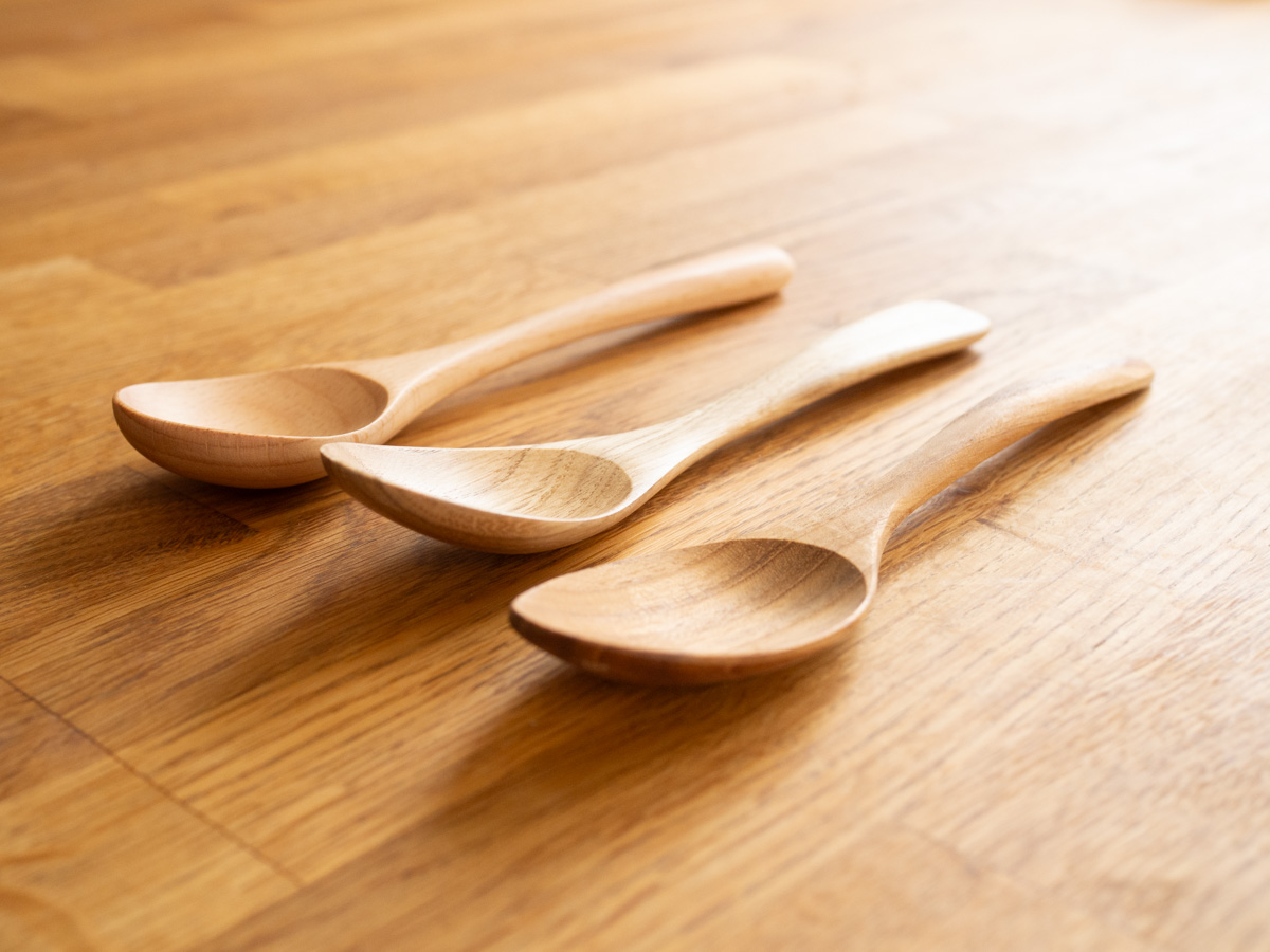 I have large wooden cooking spoons and forks and spatulas, and even larger wooden serving spoons. Plenty of wooden butter knives, even a wooden cake slice. For years already I’ve wished for a good wooden eating spoon, but never found one. I’ve run across crafts stalls selling spoons of roughly the right size, but they’ve all had a shape that’s more decorative than useful. A good eating spoon fits the shape of the human mouth. And is made of a suitable material! A spatula can be rough and scratchy, but an eating spoon needs to be as smooth as silk.