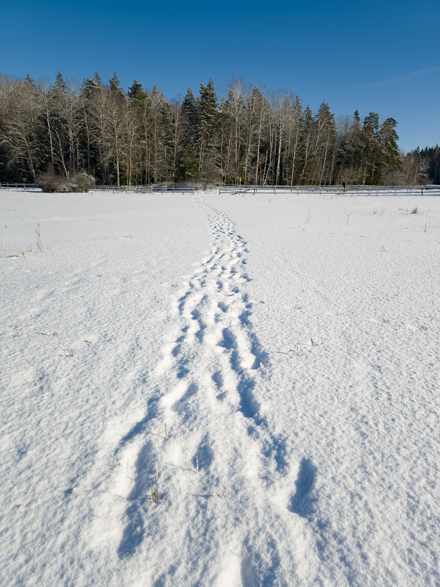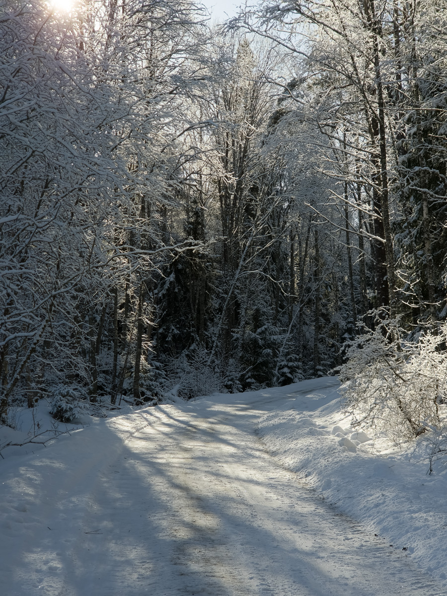 Somewhere around the northern tip of the lake got tired of the endless views of the lake and not much else and headed back for the woods. Then got tired of the wide tracks and followed a deer track through the woods, until that petered out into nothing and I just headed roughly in the right direction based on where the sun was and where I thought I saw the open space of the lake to be.