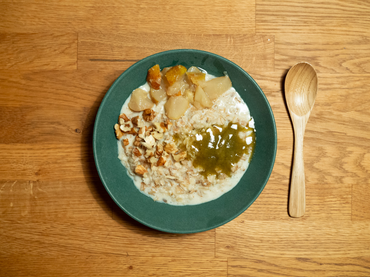 In my mind, porridge has always been a simple meal. It consists of the porridge itself and a topping. The porridge itself is utter simplicity: grains + liquid + salt. The topping can be jam, honey, fruit, or possibly even a combination such as apple sauce + cinnamon. The most adventurous that I’ve been in the past is putting (some of) the topping in the porridge: cooking the porridge with a diced apple, instead of adding apple sauce on top, and then maybe adding nuts as well. Two toppings? Where will this craziness end?