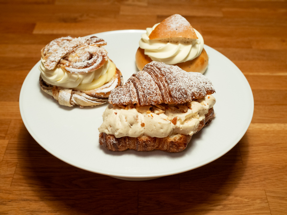 Ten-ish years ago, bakeries started offering semla-inspired products, and the creativity has only grown since then. This year Spånga Konditori offers not just traditional semla and a lactose-free one, but also vanilla semla (which vanilla custard instead of almond paste), cinnamon bun semla (also with custard) and wiener-semla (in a croissant, with the almond paste mixed up with the whipped cream).